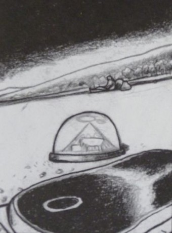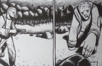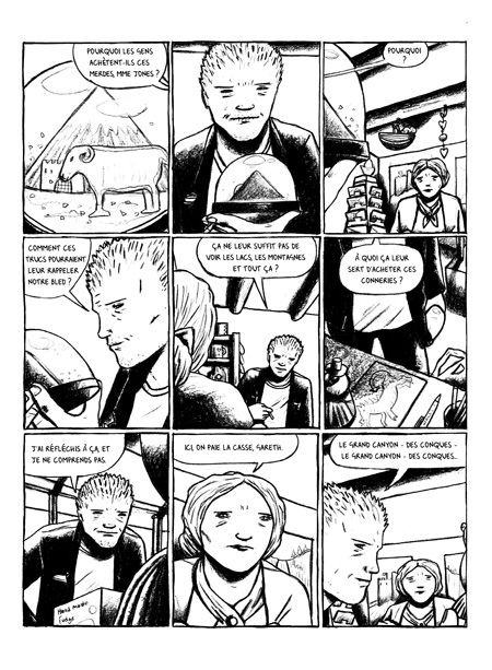 Foodboy est donc le monologue de Gary, qui se heurte au mutisme de son ami.[1] Au-delà d’une histoire d’amitié, c’est avant tout une histoire d’individualités. Gary parle tout seul et raconte son quotidien, comme s’il ânonnait un mantra pour se rassurer, pour garder les pieds bien ancrés dans sa terre galloise, misérablement réduite à une montagne et un agneau contenus dans une ridicule boule à neige pour les touristes.[2] Conscient des contingences matérielles, il tente de rallier Ross à une forme d’existence telle qu’il convient de la mener, pour ne pas s’en éloigner lui-même. S’éloigner de cette réalité, c’est fuir ces paysages désertiques que seules les ombres des arbres et des canettes de bière vides viennent repeupler. Sans multiplier les effets visuels, le trait charbonneux de Swain s’applique à rendre la difficulté des conditions de vie et le sentiment d’isolement qui oppresse les individus jusqu’à l’étouffement : ces deux thèmes trouvent leur plus belle illustration dans les deux cases représentant les poissons, au bord de la suffocation, dans la partie restante du lac qui rétrécit comme une peau de chagrin.