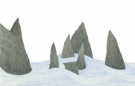 Inattendu par conséquent, ce qui devient un panorama n’est pas rectiligne, encore moins uniforme, il est modelé, en nuances, en mouvements de nature liquides, éthérés ou géologiques, dans des résonances oscillant entre complicité et hostilité. La rectitude fragile est aux constructions humaines (maisons, usine) et ce qui l’en reste ; le voluté, le torsé sont à ce qui les entoure et les domine, fait l’odyssée abrasive des éléments qui se confrontent et submergent ceux qui y vivent.