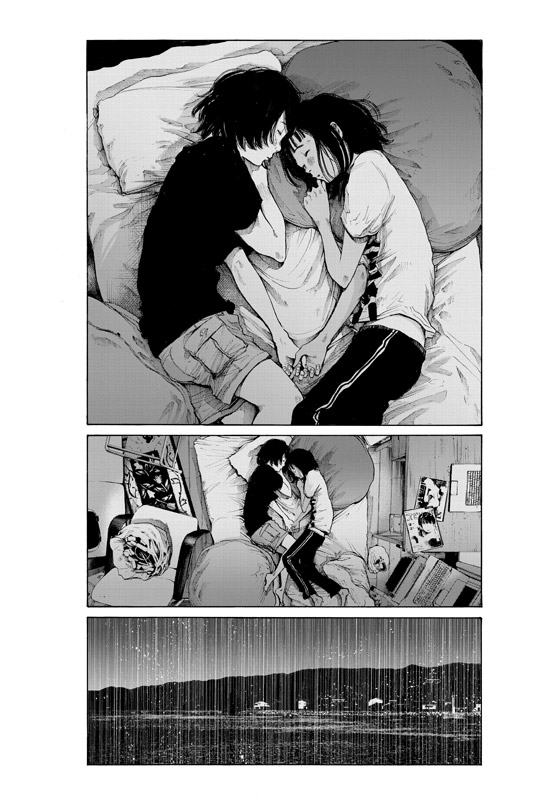 Alors, certes, ce volume conclusif passe aussi par des relations sexuelles, ce que le mangaka traite à nouveau de façon très crue et explicite. Deux des dix chapitres (les treize et quatorzième) sont exclusivement consacrés à une longue scène de coucherie (la dernière de l’ouvrage) initiée par Koume à laquelle Isobe accepte de se prêter. Nous pouvons à nouveau nous demander si faire l’amour est pour eux un passe-temps, une façon de tromper l’ennui, ou sert à oublier un mal de vivre. Et s’il s’agissait plutôt d’une recherche de sentiments entre deux êtres ? Le message des débuts serait alors brouillé. L’évolution de l’histoire tendrait alors à délivrer un message somme toute classique, pour ne pas dire caricatural : la fille doit avoir et aura de tendres sentiments pour son partenaire sexuel. Pourtant, lors d’une discussion sur l’oreiller, Isobe prévient Koume qu’il ne faut pas s’attacher à lui. Cette inversion du sentiment amoureux annonce une fin ou un nouveau départ ?