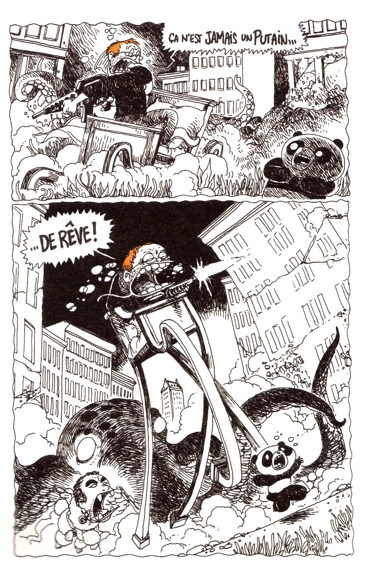 Ensuite, toutes ces formes sont digérés par le délire de l’auteur. Attention : le délire de l’auteur, ça ne veut pas juste dire que Boulet est « délirant », et que je suis trop mdr-ptdr-lol quand je lis ses notes. Non non non.[2] Ça veut dire que Boulet abolit méticuleusement les frontières entre les différentes figures de sa fantaisie : il accueille d’un bloc la totalité de ses nourritures imaginaires, des souvenirs de jouets d’enfance aux codes du manga, du cinéma d’aventure à la chronique intimiste, du carnet de voyage au cartoon, sans ménager de paliers. La composition des pages est dominée par une puissance permanente de transformation, et l’on suit en jubilant les métamorphoses qui affectent les personnages, les objets, ou les situations. Le dessin prolifère, se déchaîne, traversant tous les styles et les mélangeant avec brio, mais avec assez d’acuité et de précision pour que chacun d’entre eux soit pleinement reproduit : cette force d’hybridation des genres et des codes, soutenue par un goût constant de l’exagération graphique, porte chaque registre à son point de perfection, et le fait éclater en le combinant aux autres. Ça, c’est une des raisons principales qui me font aimer les Notes de Boulet : sa capacité à saisir les « idiomes » graphiques les plus variés, et à les endosser avec la même intensité, pour les traverser et en dévoiler les limites. La jubilation du dessin jointe à cette distance ironique qui déjoue toutes les simplifications fait de la lecture des notes un plaisir rare, tout en renouant avec les pouvoirs les plus anciens de la bande dessinée.[3]