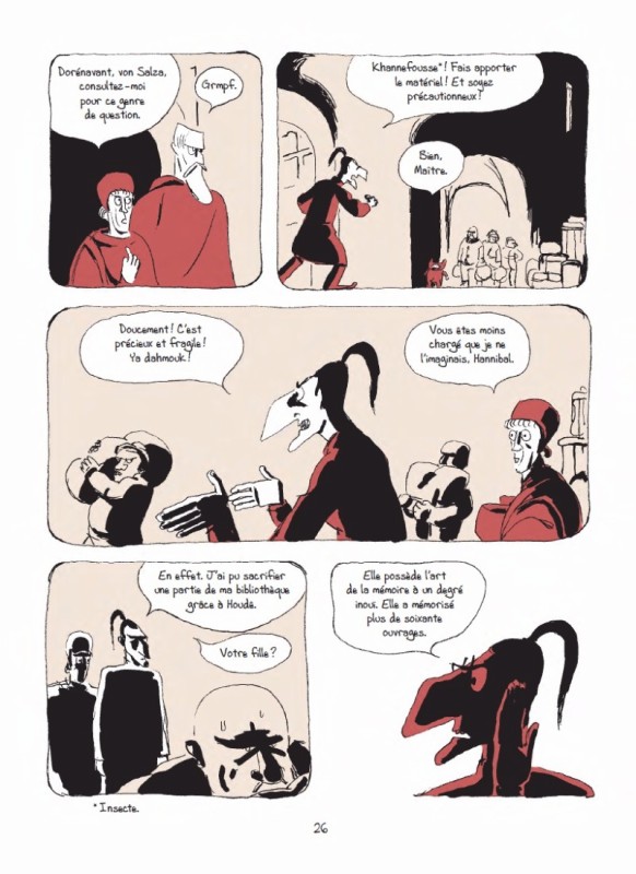 Stupor Mundi se construirait entre ces deux bornes marquant de manière spéculative les origines de l’écriture et du langage. L’album interrogerait la nature de leurs signes, de leurs rapports, de leurs autonomies, mais aussi de leur utilisation par les pouvoirs temporels et spirituels, ou bien comme outil mémoriel et scientifique. L’auteur sait montrer bien évidement aussi leurs limites, leurs paradoxes : dire la même chose mais d’une façon diamétralement opposée en changeant de langue[1], un livre que l’on cherche dans une bibliothèque, devant contenir une vérité et qui se révélera faussé, et une fillette hyper mnésique pouvant retranscrire des ouvrages entiers, mais échouant à se souvenir et à parler d’un drame récent qui la paralyse littéralement. Qui plus est, ce sera justement par une parole libérée par l’écoute et le dialogue qu’elle se souviendra, et plus particulièrement de propos s’affirmant dans la vérité du témoignage, pour ne pas dire d’un véritable testament, dans un moyen-âge façonné par la Bible et ses suites.