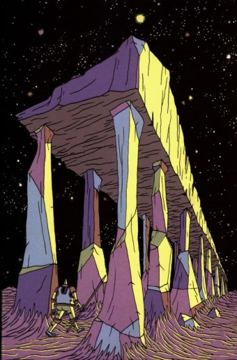 Encore une petite merveille de 3 fois par jour, dont une précédente chronique faisait déjà l’éloge, notamment pour les livres d’Idir Davaine. Il s’agit ici d’un travail opiniâtre sur l’épopée, qui fait grouiller des armées de traits fins et réguliers sur les pages, légions graphiques desquelles naissent toutes les formes géologiques, charnelles, végétales imaginables, tous mondes pris dans un incessant va et vient de genèse et de destruction formelle.