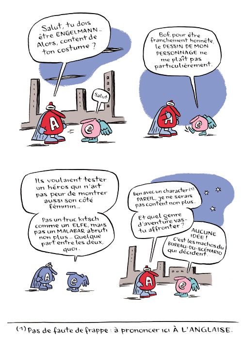 Ainsi en est-il des super-héros et, derrière le « fantasme de l’uniforme », il met à jour des visages pathétiques qui sont autant de critiques du système des comics que des portraits de paumés. La chute toujours plus longue d’Engelman (L’Association, 2011), ponctuée des moqueries de ses collègues ou des commentaires sarcastiques des lecteurs déconstruisent la figure héroïque et sa toute puissance, qui n’est bien que de papier.