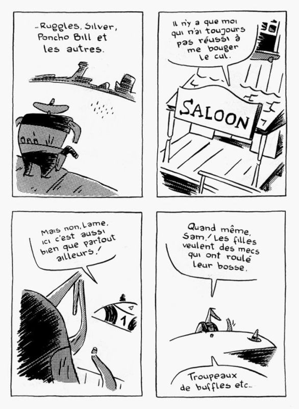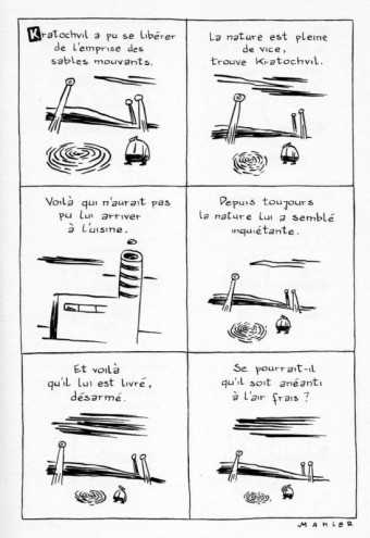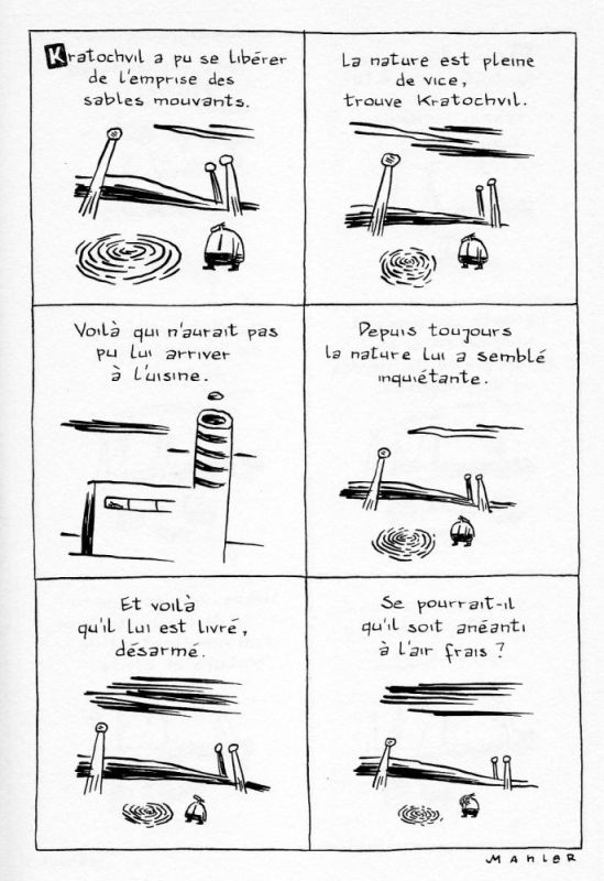 Ce loser quotidien, qui fait son métro-boulot-dodo sans joie mais qui ne voudrait surtout pas le perdre est au cœur de Kratochvil (L’Association, 2002). Ce personnage d’employé de bureau se réveillant dans une nature hostile pourrait laisser la porte ouverte à un récit d’apprentissage. Mais on est loin d’Into the Wild : dans ce recueil de strips — qui reste une des plus belles réussites de l’auteur — on voit cet anti-héros avancer sans jamais chercher autre chose que de pouvoir retourner pointer dans son univers bien balisé. Il interagit bien avec son environnement, mais contraint et forcé. Il n’est pas pour autant hystérique ou paniqué mais subit, impassible, les événements, en attendant le retour à la normale. Ce retour à l’ordre, il le sait, ne peut qu’arriver. Le livre se clôt, sans suspense, dans un retour vers sa Terre Promise : une obscure usine.