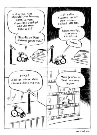 Le premier livre traduit de Nicolas Mahler est Lone Racer (1999), envoyé à l’Association et rapidement publié. Ce petit album de trente pages met en scène un ancien pilote de course vedette qui n’a pas raccroché. Les raisons sont multiples : besoin d’argent, envie de retrouver le frisson de la victoire, refus de terminer sur une note négative. Il étire donc une fin de carrière minable, qui efface ses succès passés et voit ses économies fondre, ses sponsors l’abandonner, en même temps que sa femme, au rythme des verres vidés. Une histoire pathétique comme seul Mahler, grand auteur comique mais aussi habile conteur de la nostalgie, sait les faire.