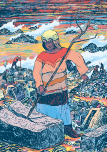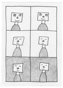 Fr. 64. Couper les liaisons que la langue y brûle, redessiner à l’oreille que les formes s’enfacent, images, en flambée, onomatopéique, verbe, sentir, qui remonte, en gorge, la narration, la vomir, l’histoire, pister l’histoire tapie chaude sous les tripes, la vomir, réserver l’aversion, expectorer, vomir, seul, au récit, gorge tripes, mouvement continu, corps communiqué, lent, vomir toute une vie. Au pas de deux, non dialectique, polarisé, intensif, insoluble, à terme, surgit : une bande dessinée.