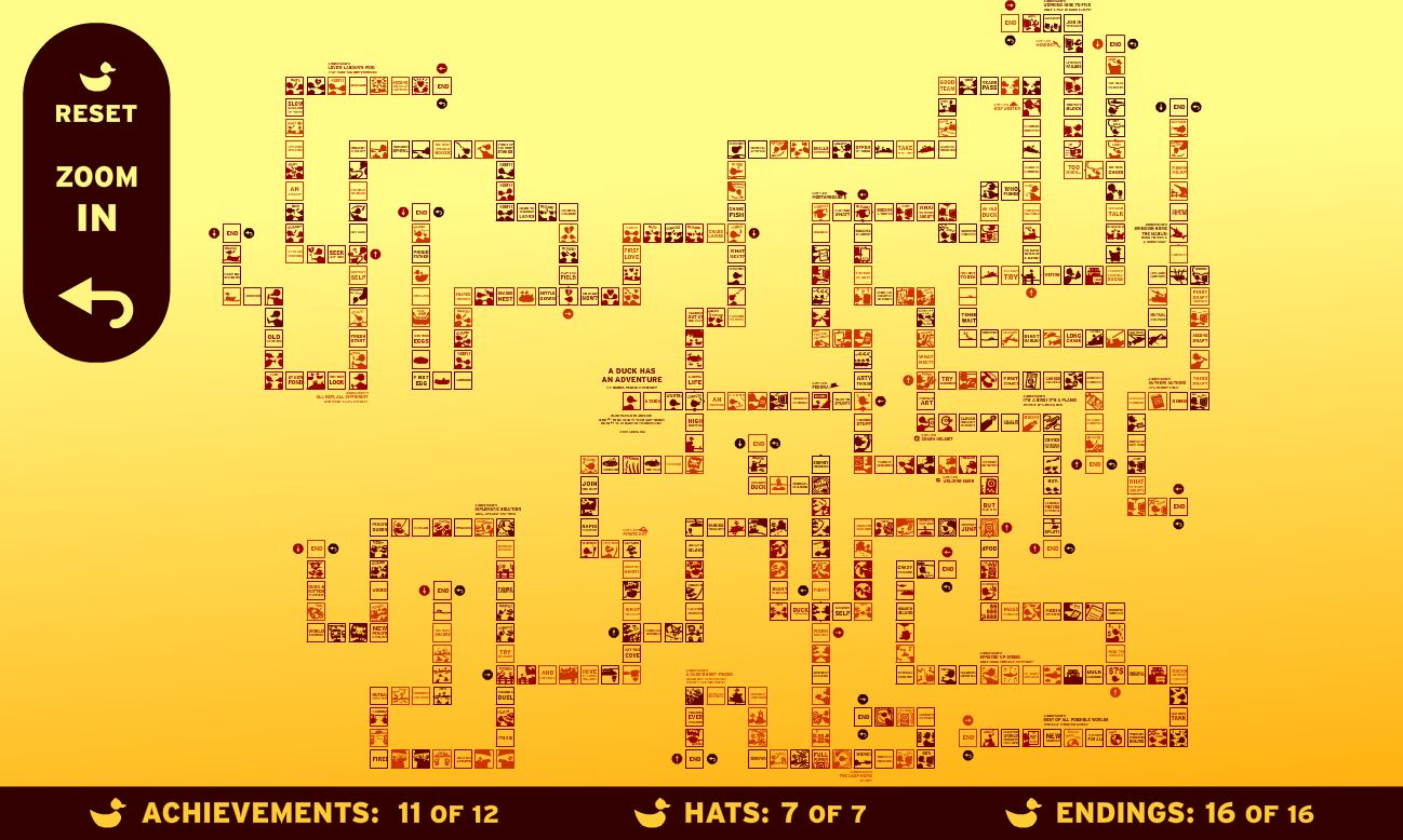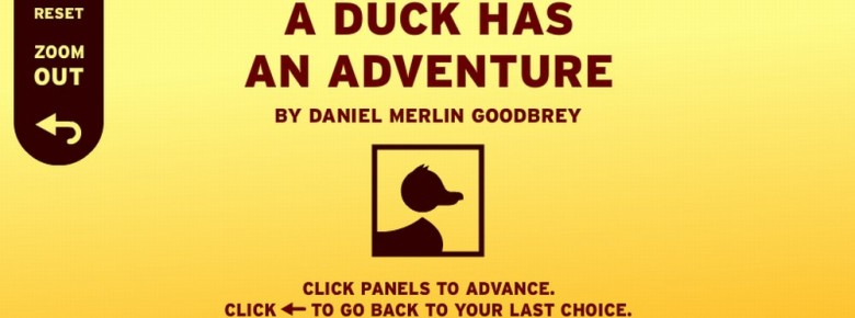 La forme choisie par « A duck has an adventure » de Daniel Merlin Goodbrey se réfère directement au vocabulaire du jeu vidéo, accumulant les « achievements », jouant la collection des couvre-chefs et comptabilisant le nombre de conclusions atteintes (parmi les 16 disponibles)[1]