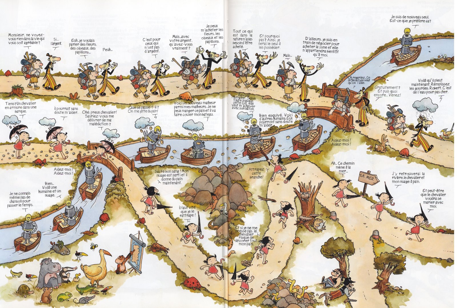 Ce qui me frappe dans les réalisations publiées (qui, pour autant, pourraient certainement donner lieu à des adaptations interactives quasi directes), c’est la manière dont la mise en situation des différentes lignes narratives fait finalement appel à des mécanismes cognitifs déjà impliqués dans la lecture de bande dessinée : la proximité de deux images entraînant la recherche et la mise à l’épreuve d’un éventuel lien générateur de sens. Et par rapport à l’opposition « narration interactive contre narration linéaire » que j’évoquais en introduction, peut-être discernerait-on ici une troisième voie, alternative, qui proposerait dans la coexistence des possibles une nouvelle manière de raconter des histoires, et pour laquelle la bande dessinée serait particulièrement adaptée.