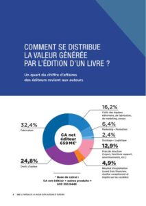 « Editeur, c’est un métier » rappellent souvent ceux-ci, soulignant en creux (volontairement ou pas) qu’être auteur, ce serait… autre chose ? Une passion, un caprice, une lubie peut-être ? Mais pas un vrai travail, qui, comme chacun sait, mérite salaire. Cela se traduit par un code couleur différent selon les postes de répartition, en quatre catégories : droits d’auteur (mauve et texte en gras), dépenses liées au livre (bleu), frais de structure (rose, texte en gras) et résultat d’exploitation avant impôt (orange soutenu, texte en gras). Le texte accompagnant ce camembert explique les critères de cette ventilation, s’attardant sur les frais de structure (tout ce qui ne relève pas directement de l’activité éditoriale) et le résultat d’exploitation (qui est ce qui reste avant impôt, bénéfice ou déficit).