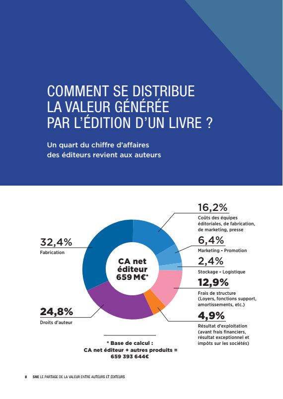 Or, mettre sur le même plan les droits d’auteurs, les frais de structure et le résultat d’exploitation en passant sous silence tout ce qui touche à l’activité éditoriale, ce n’est pas être « factuel et objectif », c’est présenter les choses d’une manière très, très discutable. On pourrait ainsi argumenter que les droits d’auteurs venant rémunérer l’activité créative de ces derniers, un minimum de cohérence voudrait que l’on les traitât au même titre que l’activité éditoriale des éditeurs, et donc en les enlevant de l’équation, non ? La réalité, c’est qu’en considérant comme à part la fabrication (qui implique un tiers, l’imprimeur), le rapport des forces est plutôt de l’ordre de 24,8 % pour les droits d’auteurs contre 42,8 % pour les éditeurs. soit presque du simple au double, ce qui est sensiblement différent.