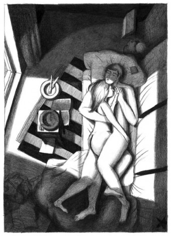 Reprenons : 002 – La montagne de sucre : étonnant objet livre, assez luxueux mais sobre, titre et signature de l’auteure (Sandrine Martin) en blanc sur fond rouge sur fond blanc – plus épuré, tu meurs. J’avais eu la chance l’an dernier de voir de près les originaux : dessins au crayon, de même format, proposant quelques images et autant d’histoires « sans paroles » qui m’avaient immédiatement fait songer au fameux oxymore cette obscure clarté[1] (car sombres et limpides, énigmatiques et parlantes : touchantes par le biais du regard). Ces dessins sont, quasiment tous, des variations sur le désir, désir amoureux pour l’essentiel, se traduisant sous forme de rêves plus ou moins éveillés, arrêtés dans leur mouvement : arrêts sur amour en ses innombrables états, naissant, en cours, finissant… Où le possible dialogue avec l’impossible, le jour avec la nuit, la lutte (le choc des chairs et des matières) avec la volupté (l’arabesque d’une fumée). Les quatre éléments sont présents, contribuant à faire trembler le réel, sans que la dessinatrice ne tombe dans les rets d’un surréalisme sur le retour (cette vielle maîtresse trop maquillée qui ne séduit plus aujourd’hui que quelques incurables nostalgiques). Si la terreur rode parfois, tout est loin d’être cauchemardesque dans ce territoire dit de «la montage de sucre», rien, ou presque, n’est sans issue… Mais le trouble est permanent. Les pleurs sont abondants. Et aussi les caresses. Chaque page ou presque me fait songer à l’incipit de Mauvais Sang de Léos Carax, un des plus beaux films des années 80 : « Il le lui a dit. Il lui a dit : veux-tu ? Elle n’a dit ni oui ni non. C’est une fille avec un garçon. » (on pourra, si on veut, intervertir les sexes, passer du masculin au féminin) Blutch avait fait, il y a quelques années, un livre un peu semblable dans sa forme, La beauté, composé d’une succession d’images non légendées. Mais Sandrine Martin ne s’en est pas fait un modèle. Son univers est autre ; les ombres de Balthus ou de Bruno Schulz ne se projettent pas en background (d’autres hantent ces pages, probablement, mais plus difficilement nommables). Ses dessins surgissent comme autant de feuilles arrachées à un journal tenu au jour le jour (certes peu « jeté » : travaillé avec l’application nécessaire pour rendre avec exactitude sa vision). Cela confirme une fois de plus que dessiner, c’est suivre le cheminement de l’idée, tenir le cap, même si le sens ne cesse d’échapper, du moins en grande partie, même si on ne sait pas forcément par avance où le trait va nous mener (et d’ailleurs le plus souvent, ça nous conduit, comme par hasard, là où précisément ça dérange…). En cela, cette Montagne de sucre est davantage ouverte que fermée : s’il est clair que Sandrine Martin a le désir d’être «comprise» (elle ne cherche pas particulièrement à se montrer obscure), il n’y a pas pour autant de prétention à imposer une lecture ; chacun est libre de confronter son propre monde intérieur à ce que le dessin révèle en surface ; le partage de l’intime est de règle, il requiert un véritable dialogue, d’autant plus ouvert, justement, qu’aucun mot de passe n’est requis : pas de clé, ni de serrure à forcer… Juste les quatre mots du titre (évoquant forme et matière – présentes à plus d’un titre) qui demeurera ni plus ni moins énigmatique que le nom de la maison d’édition qui apparaît, au dos du livre, réduit à son initiale, dessinée en forme de dragon.