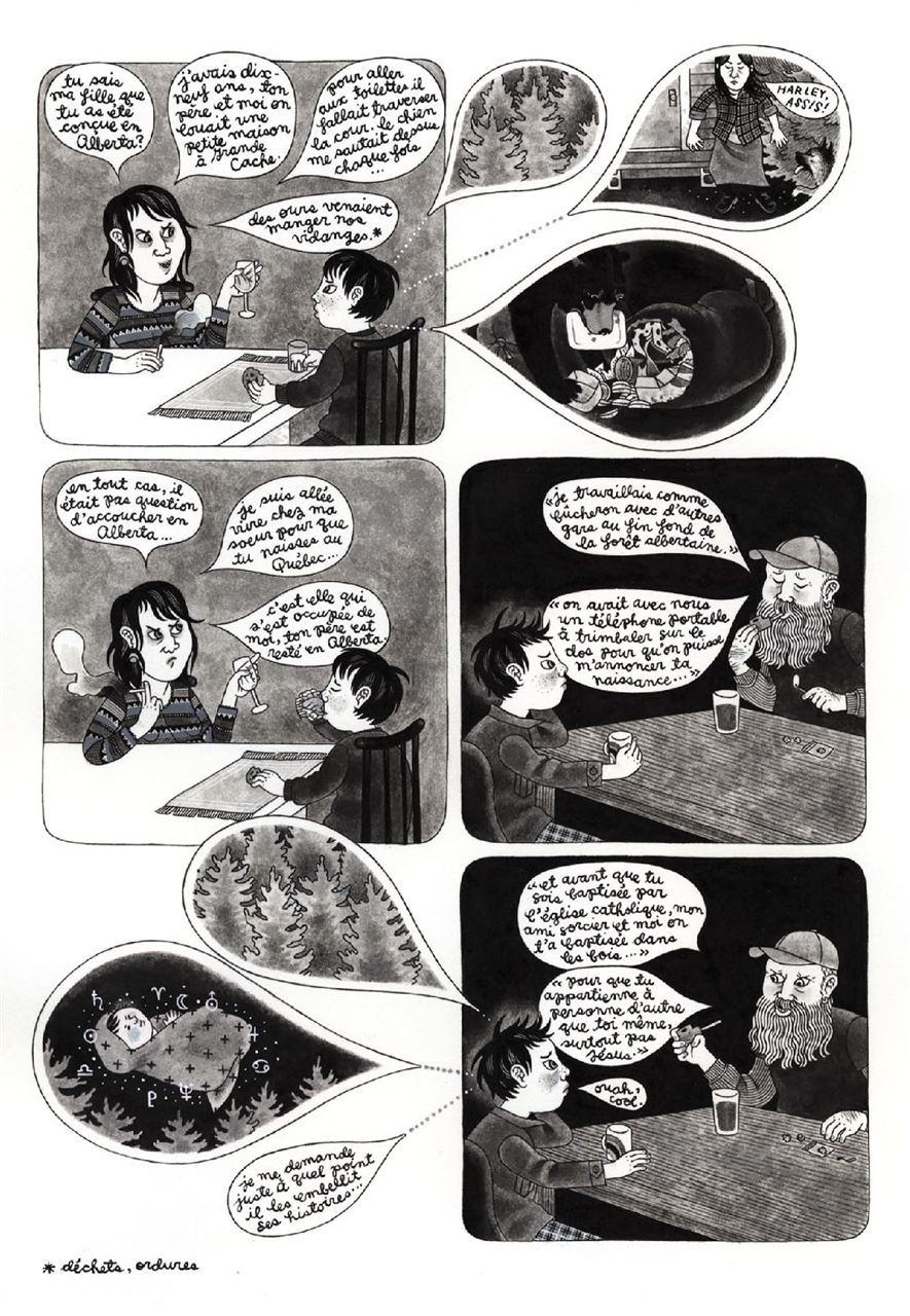 001 – Susceptible. De Geneviève Castrée, Canadienne trentenaire (de la même génération que Sandrine Martin). Elle dessine, et chante parfois seule sur scène (avec guitare et quelques effets de feedback). Le titre de cette bande dessinée n’est pas à prendre avec des pincettes, mais en respectant sa polysémie (on aurait tort de privilégier tel ou tel sens). Nous sommes là en ce territoire que Jean-Christophe Menu arpente volontiers (nul étonnement de le voir ouvrir le catalogue de sa maison d’édition avec ce livre), celui du récit autobiographique en bande dessinée : récit d’enfance, avançant chronologiquement par brèves remémorations – et quelques épiphanies. Se souvenir provoque sans cesse des courts-circuits. C’est toujours le même problème : comment (se) raconter, comment faire passer dans l’écriture (mots, images, mêlés) ce qui nous est arrivé, ce lointain proche qui s’est déposé dans la mémoire, peu à peu décanté, inévitablement transformé. Les traces du passé reviennent souvent effilochées ou, au contraire, par blocs compacts, rarement en bon état, et toutes ces bribes peinent à raccorder. C’est là que le travail d’écriture intervient, non pour combler les manques, mais pour réinventer ce qui eut lieu, réinterpréter les choses dans la langue du présent. Sur le plan visuel, dans Susceptible, ce sont les matières – délicates, variées, donnant aux gris toute leur puissance émotionnelle – qui frappent. Puis on découvre les visages et on commence à déchiffrer le récit et les dialogues tracés en lettres attachées, usant d’un style enfantin et appliqué. Il faudrait en parler en évitant de tomber dans la psychologie des magazines. « Ma mère est la dernière née d’une famille de 16 enfants. Son père est mort quand quelle était encore très jeune ». Elle sera usuellement nommée par sa fille, tout au long du livre, L’Amère (découvrant cela, je notai aussitôt, un peu ironiquement : signifiant barré, non au sens lacanien, mais à celui, plus commun, d’être en dérive). L’Amère est mère, à peine, et pourtant là, présente autant qu’absente jusqu’à ce qu’elle ne contrôle plus ses incessants passages d’un état à l’autre, et ainsi ne « comble » plus celle qui deviendra peut-être mère à son tour. Amer est l’amant de L’Amère. Comme « susceptible » a plusieurs sens, «amer/amère» renvoie aussi bien à la mer (les amers : navigation et points de repère) qu’à l’amertume, évidemment (et donc à la bile, fluide de la mélancolie). Le père, parti loin, au-delà de Vancouver, de l’autre côté du Canada, est surnommé Tête d’œuf et ne parle pas français. La petite fille apprend à parler deux langues : la maternelle (dont l’usage est quotidien) et la paternelle (qu’elle ne comprend pas, dans un premier temps – ou si mal : il lui faut pour la saisir, aller passer quelque temps dans « le royaume mythique où les papas disparaissent »). Le temps passe de manière parfois étrange dans ce livre : temps de l’abandon et des retrouvailles, de la peur et du lien qui a le pouvoir de renverser la peur. On ne va pas ici raconter l’histoire, banale dans ses grandes lignes et pourtant singulière en ses détails. Encore et toujours ces histoires de famille avec séparation des parents (ici quasi-immédiate), surgissement dérangeant de leurs nouveaux partenaires (amis, ennemis, indifférents), problèmes matériels incessants et le temps (ou l’énergie) qui manque pour recoller tout ça. Cela ne fait pas forcément un livre, sauf si, comme le fait Geneviève Castrée, on s’invente une langue à soi. Grandir, c’est devoir piocher dans la réserve où l’on a déposé ses rêves en lieu et place des jouets perdus pour en faire, à l’instant voulu, quelque chose qui aide à vivre…