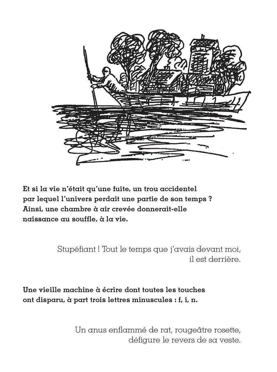 003 – Penses-Bêtes. Ce livre de Roland Topor est paru une première fois en 1992 au « cherche midi éditeur » dans la collection «Les pensées» où se côtoyaient le meilleur et le pire : Pierre Dac et Philippe Bouvard, Oscar Wilde et Jean Dutourd. En incipit de ce livre très décalé (il a le génie de s’intituler Penses-Bêtes et non Les pensées de Roland Topor), cette phrase : « J’ai trouvé ce livre au fond de mon sac de linge sale ». Plus loin, on trouvera des variations sur « ce sac de linge sale dans lequel il avait mis tout son amour propre » dont la dernière est : « Dans son sac de linge, on n’a retrouvé que des feuilles de papier sales et froissées ». De « Je suis né… » à « Le passé se rapproche dangereusement », du premier poème au dernier aphorisme, le lecteur peut circuler librement : inutile de se laisser prendre au piège d’une lecture ordonnée, servilement linéaire ; nombre de parcours sont possibles et ils se valent tous. On est plus près de la poésie que de la prose ; on trouve ici d’étonnants monostiches et quelques assertions bien senties comme « La pensée contraire est érotique ». On aimerait tout citer, on aimerait dire que rien – y compris les choses les plus rapidement jetées – ne tombe à plat (même si l’écriture aphoristique est souvent décevante, au bon sens du terme, car elle évite le développement ; elle ne frustre que ceux qui ont besoin d’explications : le « savoir décevoir » est la marque de reconnaissance des grands artistes). Quant aux images – dessins vites tracés, sans apprêt, impeccables –, elles font office de ponctuation : elles donnent au texte, non une somme d’illustrations, mais quelque chose de plus vital, comme de l’air. La nouvelle édition respire, au contraire de l’ancienne. Menu a eu la bonne idée de spatialiser les fragments, de donner à chacun, de coup de dés en coup de dés, sa juste place dans l’espace des doubles pages. « Il s’est tellement préparé à la mort que la vie l’impatiente ». On sent à chaque ligne ce qu’est véritablement l’urgence – celle que seuls les inactuels savent saisir et traduire. Topor est définitivement de notre temps, du côté des résistants (remarque en passant : comme je cherchais dans une très grande librairie où pouvait bien être rangé ce livre que j’imaginais à proximité des livres des éditions Wombat, elles aussi coupables de rééditer Topor ou DDT, donc du côté des romans et nouvelles, j’ai fini, en bout de course, par le trouver au rayon « art contemporain », à côté d’un livre de Catherine Millet).