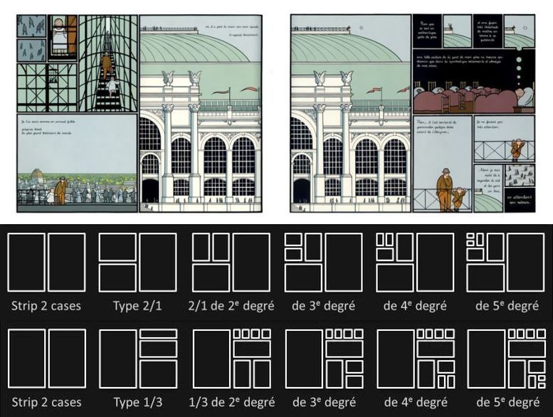 Cette page est construite sur la base d’une bande, ou strip, de deux cases. La première de ces deux cases est ensuite fragmentée en deux vignettes, placées l’une au-dessus de l’autre. On obtient ainsi une bande fragmentée de type «2/1» (c’est un modèle de fragmentation, une façon de diviser les cases, assez courant, mais souvent problématique). Puis, dans ce nouveau groupe de trois vignettes, on fragmente une nouvelle fois la première, cette fois horizontalement. On obtient une fragmentation de 2e degré. Le modèle qui en découle est appelé «2/1 de 2e degré».