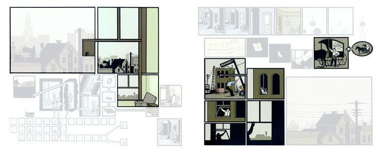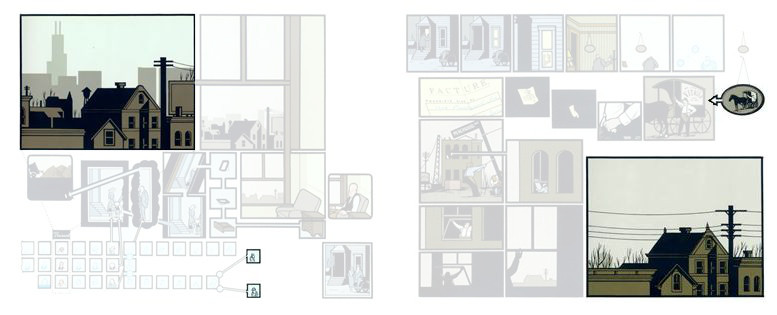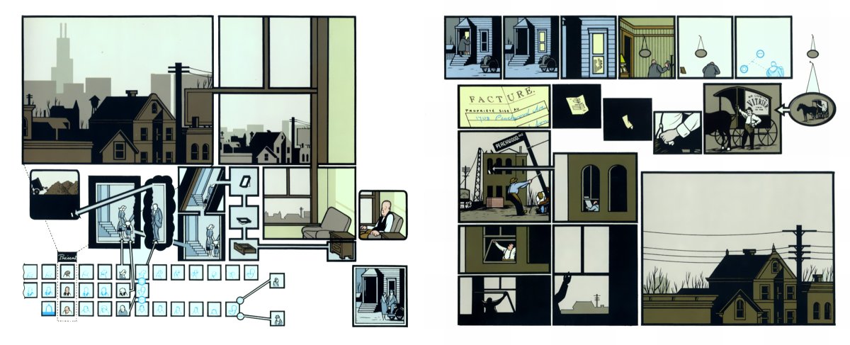 Il faut signaler que cette façon de procéder n’est absolument pas spécifique à Chris Ware. Si l’Américain nous fait ici une superbe démonstration, non exempte de caractères remarquables jamais assemblés de la sorte à notre connaissance, il n’invente pas la composition qu’il utilise.