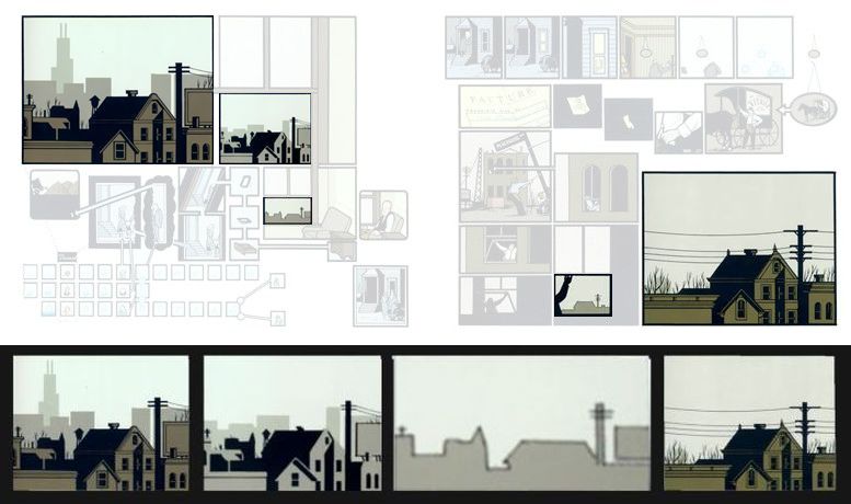 D’ailleurs, cette scène même n’existe pas. Elle n’est que la reconstitution a posteriori et fantasmée de l’événement par l’enfant : « Une telle audace de la part de mon père ne trouve son chemin que dans la symbolique récurrente et abrégée de mes rêves », est-il écrit. La figure de l’enfant qui rêve, face à une immense bâtisse, est très certainement une citation directe de McCay. Deux pages plus tôt, on pouvait également remarquer aussi une projection de chronophotographies, qui évoque immanquablement Frost, un autre dessinateur américain (on se reportera au travail de Thierry Smolderen pour plus d’infos à ce sujet). Ici encore, Ware affirme sa filiation de dessinateur.