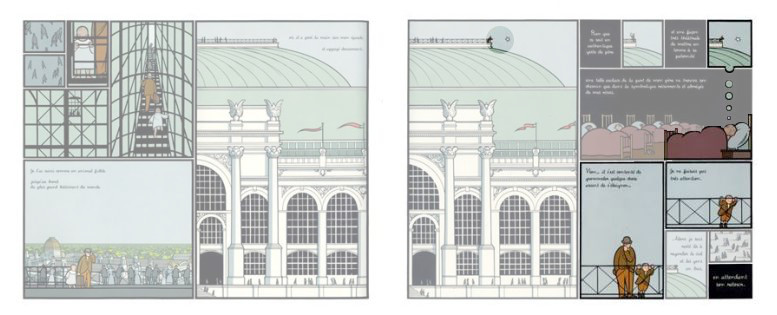 Il faut dire que ce qui peut paraître évident quand on regarde cette composition ne l’est absolument pas. Le rapport des figures, c’est-à-dire le rapport entre les représentations, qui articule l’individu (petit) et le bâtiment (autrement dit le lieu où son existence — immense, se déroule), s’exerce également entre les cases. Insistons : il n’y a rien d’évident à cela. Le dessinateur aurait pu préférer montrer de grandes scènes de foules dans de vastes cases. Mais il n’en est rien. Même les foules sont minuscules et écrasées par cet immense édifice.