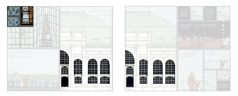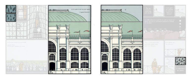 Je vais terminer avec la trajectoire de lecture, en parcourant la fragmentation. La lecture de cette double planche fait apparaître des variations, des oscillations du regard, en ouverture et en fermeture de la composition. La place particulière des deux cases centrales est aussi, en termes de lecture et non plus de rapport entre les cases, un moment spécifique, un moment qui semble suspendu sur cet énorme bâtiment dont la représentation gigantesque occulte, mais pas totalement, la représentation allégorique de l’abandon de l’enfant.