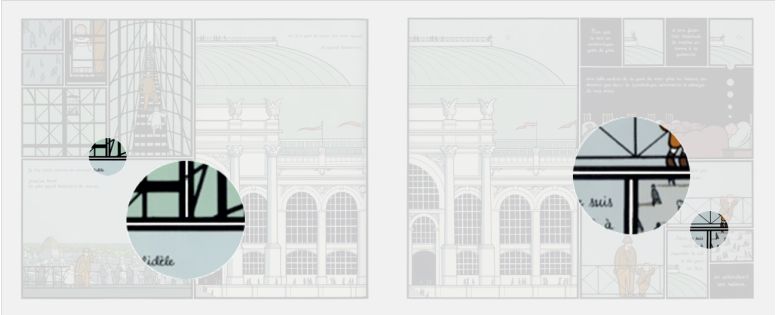 J’attire votre attention sur la façon dont on peut commenter ces planches. Vous voyez les schémas qui apparaissent selon les zones que je vous montre, en fonction des thématiques que je veux faire ressortir. Tous les éléments de cette planche sont en relation les uns avec les autres, que ce soit en termes visuels, graphiques, ou thématiques.