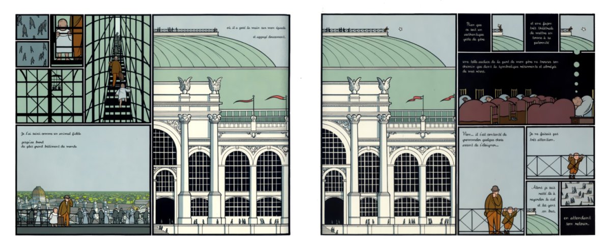 Contrairement aux deux premières planches, ici, l’ouverture et la fermeture de la séquence sont dévolues à la représentation des humains, tandis que la construction occupe le centre de la double page. Dans la séquence précédente, on pouvait constater l’importance de la maison, qui accompagnait le passage des générations. Celles-ci, en quelque sorte, partageaient le même toit. Dans la double planche actuelle, personne ne partage ce bâtiment. D’ailleurs, on ne fait que monter sur son toit, pas habiter dessous. Cet immense édifice, qui a été construit pour une sorte d’exposition universelle, la «World’s Colombian Exposition» de 1893, n’est pas fait pour être habité, mais pour impressionner les foules. Il n’est probablement pas destiné à perdurer.