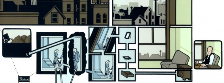Cette façon de faire est une constante chez Chris Ware, et ce n’est pas un hasard que son dernier livre s’intitule Building Stories ; il n’est pas anodin non plus que ce livre soit placé dans une boite. (On pourra évoquer une autre fois cette représentation de la boite en bande dessinée, qui est souvent très proche de la représentation du bâtiment.)