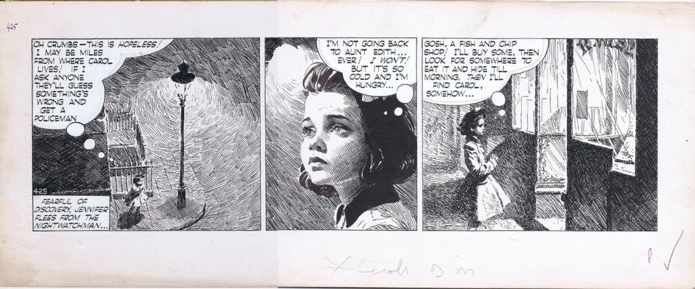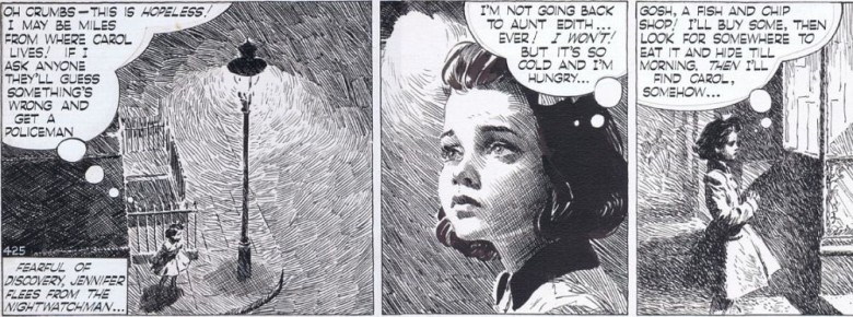 La première opposition s’établit entre la notion d’ »auto-contenu » et celle de « continuité ». Regardez la première case, avec son titre : « Fearful of discovery, Jennifer flees from the nightwatchman » — « craignant d’être découverte Jennifer s’enfuit du gardien de nuit ». Ça pourrait être le titre de n’importe quel tableau, cela pourrait être un tableau allégorique. D’ailleurs, c’est un tableau allégorique : regardez cette pauvre malheureuse sous son réverbère, c’est une petite fille en train de fuguer. Le réverbère c’est l’œil de la loi, le regard de sa conscience aussi. C’est donc un tableau allégorique — un aspect auto-contenu. Mais en même temps, c’est lié à ce qui précède, puisque nous découvrons (si nous n’avons pas lu le Daily Mail de la veille) qu’il y a une petite fille qui est en train de fuguer et que dans le strip précédent elle a rencontré un Bobby qui faisait sa ronde.
