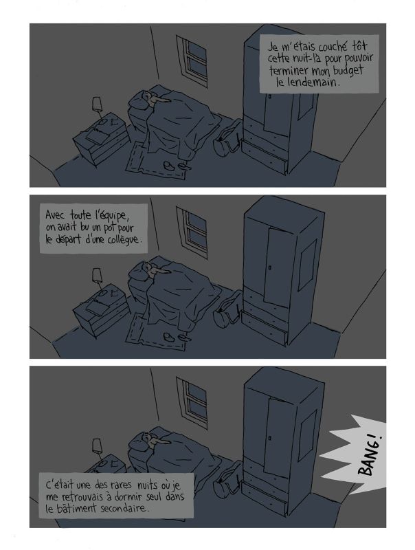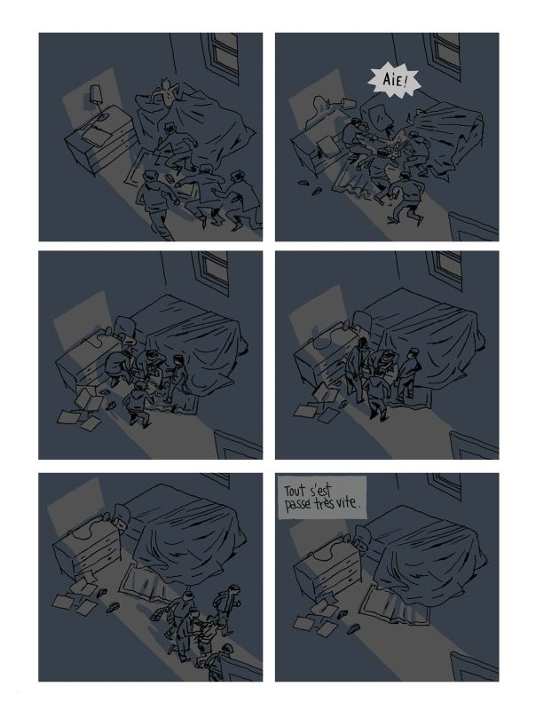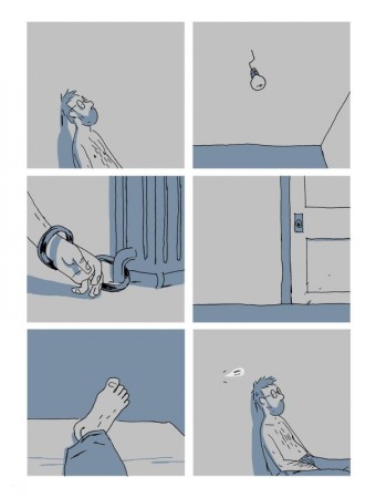 Xavier Guilbert : Quand on fait un livre qui est la biographie de quelqu’un, il y a souvent tout un travail de documentation et de repérage. Là, j’ai l’impression que c’était plus un travail qui consistait à saisir son état d’esprit, sa manière de parler. Parce que sans vouloir dévoiler l’ensemble du récit, ça se passe principalement dans un lieu pour lequel la documentation n’est pas vraiment essentielle : c’est une pièce relativement vide, avec un radiateur. Et en dehors de quelques pages au début et à la fin, on est dans un huis-clos. C’était particulier de travailler avec ces contraintes ?
