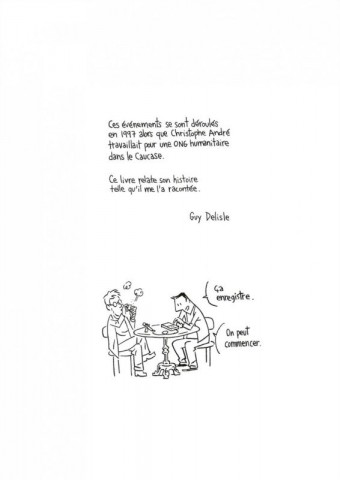 Guy Delisle : Pas trop, non. Les éditeurs, comme je leur ai dit que — moins que les gens qui peuvent m’écrire, et qui ont toujours des trucs incroyables à raconter. On ne me sollicite pas des masses — ça dépend des projets que j’ai. Non, sachant que nous n’allions plus repartir comme ça, moi, faire un voyage qui serait de l’ordre touristique, je n’ai rien à raconter en revenant. Ça me plaît bien, d’aller voir les grandes pyramides, et puis tous ces trucs-là, mais de raconter mon voyage… Il faut vraiment que je sois un peu inséré dans la population et que je me dise : « tiens, ça, ça m’a l’air un peu intéressant. » En fait, il m’en faut de plus en plus, parce qu’à force d’être dans des endroits différents, j’ai un peu l’impression de me répéter. De toute façon, on ne fait plus ce genre de voyage, mais… voilà, on verra. Peut-être qu’un jour, si ma compagne s’ennuie vraiment beaucoup à la retraite et qu’elle a envie de repartir, je l’accompagnerai, mais ce sera vraiment une autre forme (rire). C’est pour ça que j’ai voulu, dans S’enfuir, dès les premières pages, clarifier la situation. C’est-à-dire que je me dessine, moi, avec Christophe, pour qu’on ne croie pas que maintenant je porte des lunettes et que je me suis fait pousser la barbe et que je porte des chemises un peu trouées. Dès le début, j’écris que ces événements ont été vécus par Christophe André, qu’il m’a relaté son histoire, et je me dessine pour qu’on voit la situation dans laquelle j’ai enregistré ces bandes avec lui pour produire ce témoignage. J’avais un peu peur que, parlant à la première personne, me mettant dans sa tête, que les gens disent : « ah, tiens, qu’est-ce qu’il fout en Tchétchénie ? » (rire). Voilà, je ne voulais pas qu’il y ait de confusion.