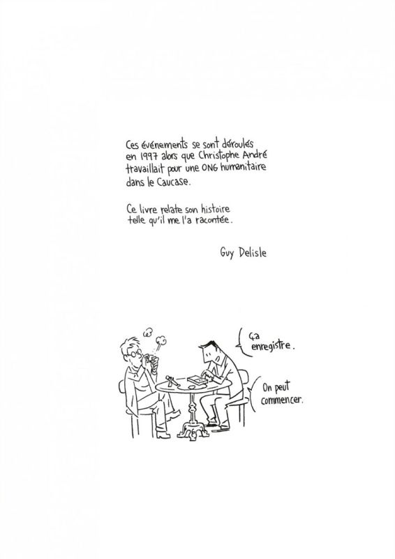 Guy Delisle : Oui, cet album est différent en tout, parce que je ne me dessine pas. C’est un récit — ma femme travaillait dans l’humanitaire, et on côtoyait beaucoup de gens qui partent dans l’humanitaire. Et un soir, j’ai rencontré Christophe André. Dans Shenzen, dans les toutes premières pages, j’évoquais son histoire que j’avais lue dans le journal : la solitude en Chine me fait penser à lui qui a dû vivre quelque chose de beaucoup plus intense, et ça me réconforte. Quelqu’un m’a dit, « tiens, Christophe est là, tu parles de lui dans la bande dessinée », et je suis allé manger avec ce gars. Dans l’humanitaire, tout le monde a des histoires à raconter : ces gens-là se retrouvent dans des situations assez tendues, dans des milieux où personne ne va et où aucun touriste ne peut aller, donc ils ont tous des histoires assez incroyables à raconter. Et celle que Christophe m’a raconté de son séjour — enfin, son séjour, ce n’est pas vraiment un séjour — de son enlèvement, de son kidnapping, m’a fasciné le plus parmi ces histoires. Ce qui est étonnant, c’est qu’il se confiait assez facilement. Je pensais que souvent, les kidnappés, c’est un peu un traumatisme, donc ils n’ont pas envie de parler de ça. Mais en fait, il s’ouvrait très facilement. « Comment tu tenais le coup ? » Alors il me racontait toutes ces histoires : le matin, se lever, retenir le temps absolument — comme c’était le seul repère qu’il avait. Quand il parlait de chacun de ces détails, j’étais fasciné, et je lui ai dit, après le repas : il faudrait faire une bande dessinée avec ça. Il était d’accord, il connaissait un peu mon travail, il était partant. Après, bon, ça m’a pris beaucoup de temps à m’y mettre vraiment, parce que d’autres bandes dessinées prenaient le pas, mon travail aussi, et ça a pris, en tout, quinze ans pour arriver à le sortir la semaine dernière.
