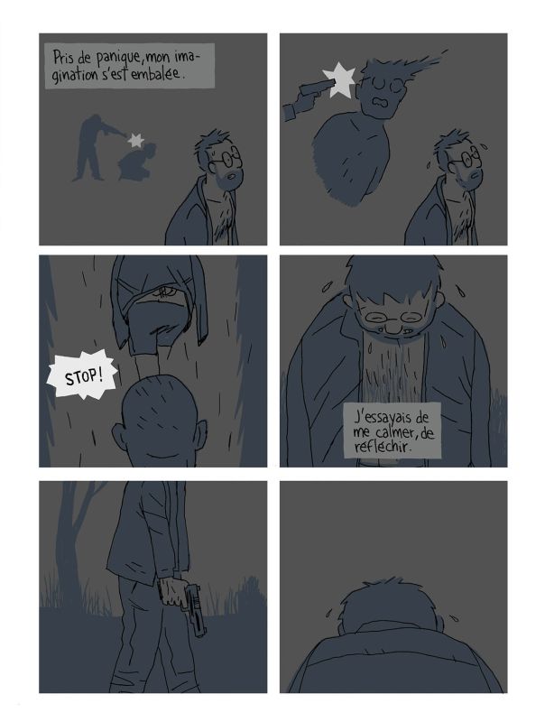 Il y a eu ça, et il y a eu des trucs un peu plus comiques : à un moment, il s’imagine qu’il s’évade, il donne un coup de poing à ce jeune, et moi j’avais dessiné qu’il poussait la jeune femme qui était là. Il la pousse, en courant, et elle tombe à la renverse. Et il me dit : « non, ça, ce n’est pas possible, même si je m’enfuis et que je suis fâché, je ne pousserai jamais une femme. » Donc j’ai redessiné : il court, et elle le regarde passer, comme ça, surprise (rire). Voilà, il est comme ça. Il y a aussi l’événement où il y a une kalachnikov qui traîne un peu, le gars fait à bouffer, la kalach’ est là, et il se dit : « là, je pourrais choper cette kalach’, je le mets en joue, et je lui saute dessus s’il le faut ». Ça a duré quelques secondes, il s’est dit : « est-ce que je peux tirer sur quelqu’un ? » Mais quand ensuite il se retrouve seul et qu’il réfléchit, il se dit : « non, même ce gars qui me fait des saucisses qui par ailleurs sont très bonnes, je ne pourrais pas tirer sur ce gars, je ne peux pas faire ça. »
