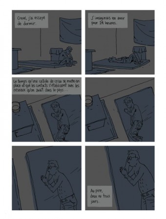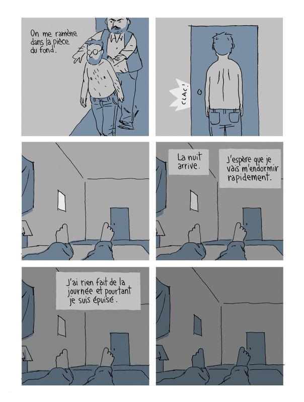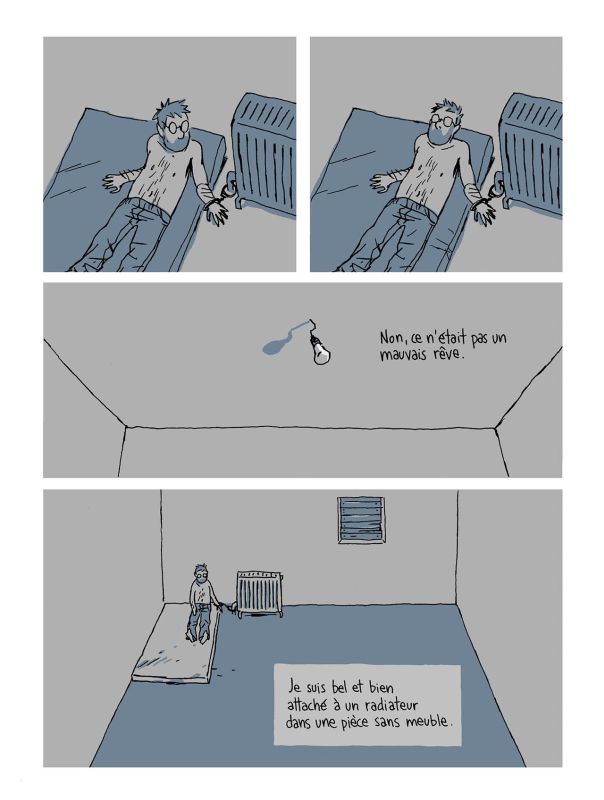 En bande dessinée, on pense un peu à tous les aspects : le dessin est un peu fragile, il est un peu léger, parce que je voulais qu’on sente aussi cette fragilité qu’il avait. Je ne voulais pas avoir des gros noirs, des trucs très présents, très solides, parce que tout cela est assez fébrile. C’est un petit dessin qui tremble, qui est un peu plus réaliste que ce que je fais habituellement, parce que là, l’histoire étant plus sérieuse, cela appelait ça naturellement. Très peu de couleurs, parce que lui était dans la pénombre tout le temps, m’a-t’il dit. Je n’allais pas mettre des couleurs à la Lucky Luke. Et après, le gaufrier, voilà, c’est carré, c’est répétitif, et c’est une forme qui là, pour le coup, était parfaite pour avoir la routine et sentir le temps qui passe. Ça, c’était vraiment essentiel pour moi dans la bande dessinée, je voulais que le lecteur sente les minutes, voire presque les secondes au début. Au début, il croit qu’il est là pour un week-end : il se dit « lundi, je reviens au boulot, et ouf, quelle aventure ! » Après, le week-end passe, et personne ne vient le chercher. Une semaine passe, et après, me dit-il, « tu commences à réfléchir en termes de semaines, en termes de mois, et là tu vois Noël qui arrive et l’angoisse qui commence. » Alors il se dit qu’il faut qu’il arrête de penser à ça.