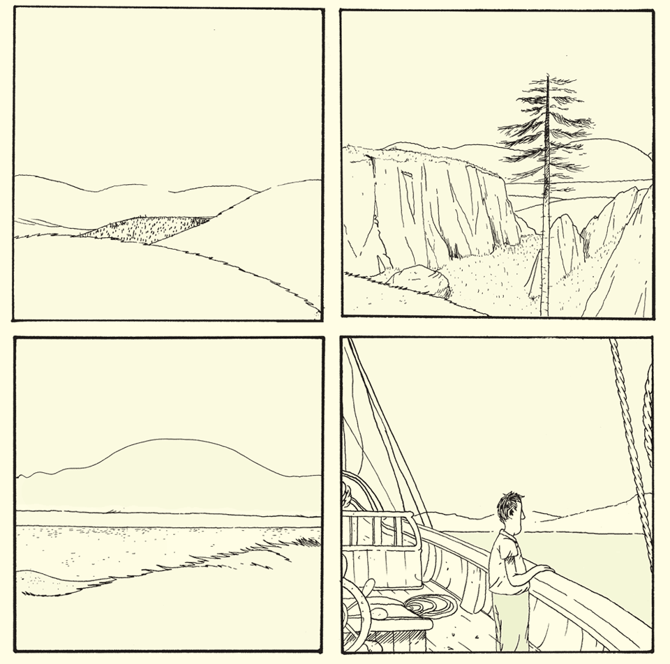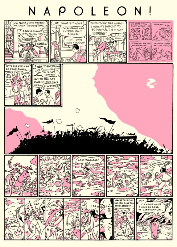 Xavier Guilbert : Pour continuer sur ton travail, j’ai été frappé par une chose : j’ai l’impression que tu as une conscience aiguë de la manière dont tu utilises l’espace de la page — ce qui nous ramène à la discussion que nous avons eue à propos des grandes pages de Kramers #7. C’est presque schizophrène, parce qu’il y a le gaufrier de deux cases sur deux que tu utilises dans Poor Sailor ou dans Somersaulting. Pour moi, il y a là quelque chose de très contemplatif, avec beaucoup de cases muettes, et la narration prend son temps pour progresser. Et puis il y a ces séquences qui m’évoquent beaucoup le travail de Seth dans ses petits livres comme Wimbledon Green et sa suite, avec beaucoup de choses qu’on essaie de faire rentrer dans la page avec de toutes petites cases. La planche sur Napoléon en est un bon exemple. Comment choisis-tu entre ces deux approches ?
