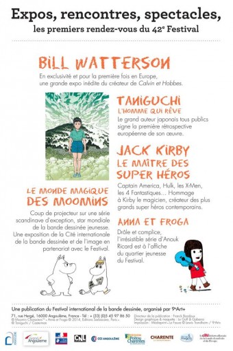 Il reste encore bien du temps avant la grand-messe de la conférence de presse du Festival d’Angoulême (qui se tient traditionnellement début décembre), mais petit à petit, le voile se lève sur la programmation à venir. Et d’annoncer, dès la fin du mois de juin, une flopée d’expositions — Bill Watterson, Taniguchi – L’homme qui rêve, Jack Kirby – Le Maître des super héros, Le monde magique des Moomins, Anna et Froga, auxquelles il faut rajouter l’exposition-anniversaire de L’employé du moi pour ses quinze ans d’activité. Et puis tiens, petite nouveauté, le Festival qui s’essaie au Web 2.0 : «Les Jeunes Talents s’exposent avec KissKissBankBank, jusqu’au 15/07 votez pour votre projet préféré !»